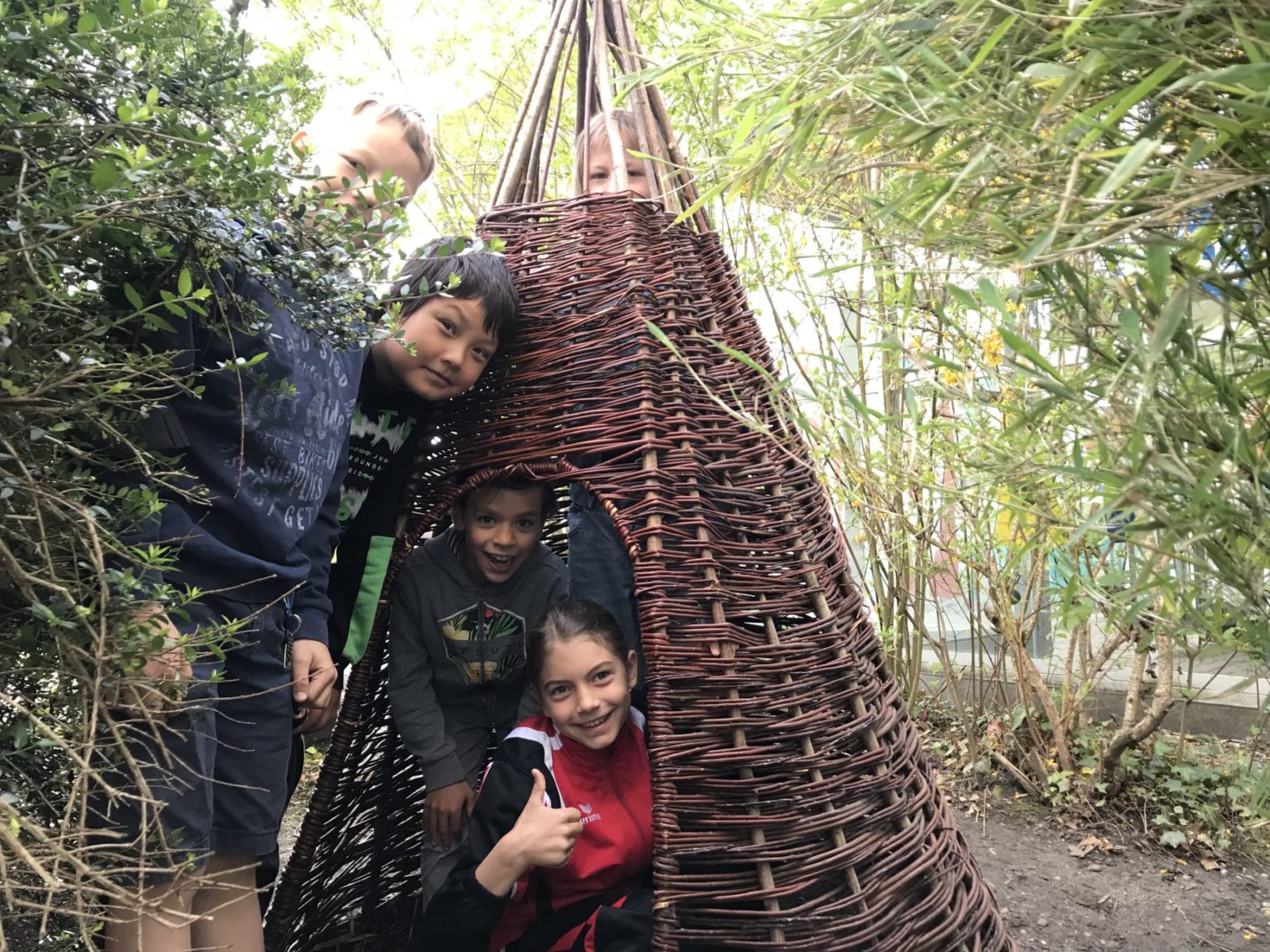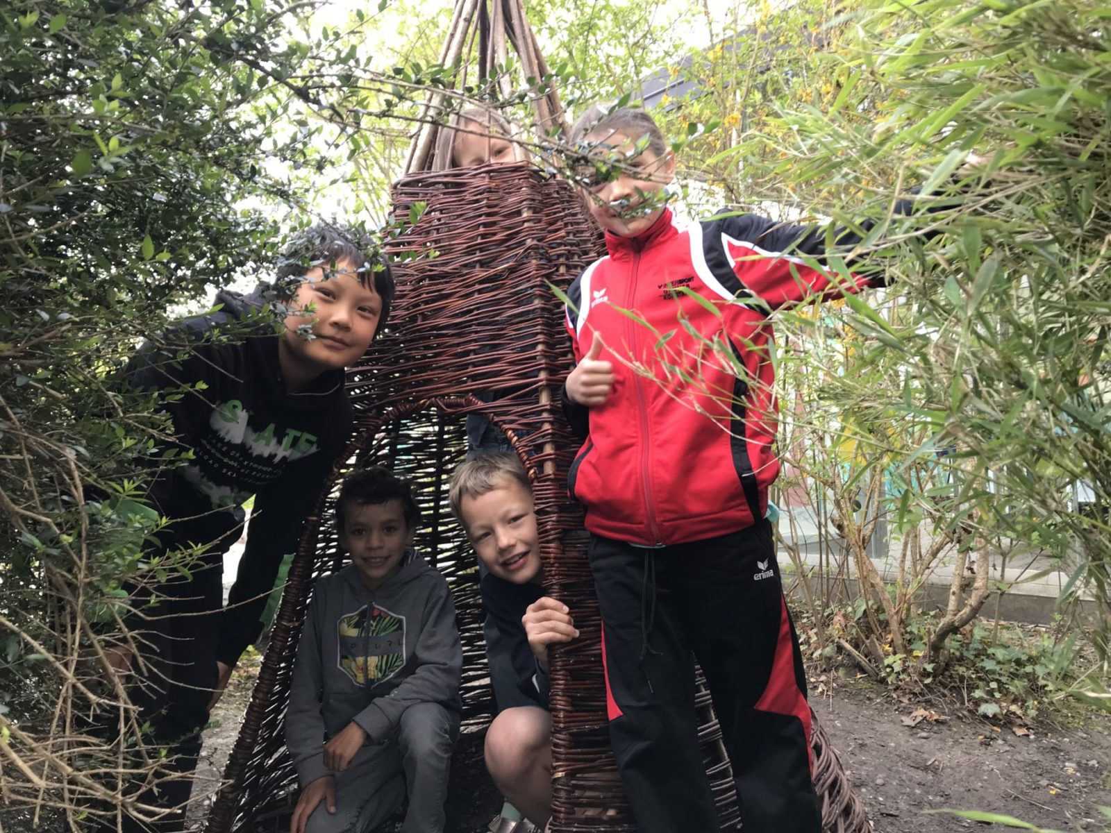 Vielen Dank dem Förderverein, der für die Kinder zwei Weidentipis kaufte! Schon beim Aufstellen der Weidentipis war das Interesse gross. In jeder Pause und auch während der Mittagszeit sind die Tipis Mittelpunkt im Spiel der Kinder.